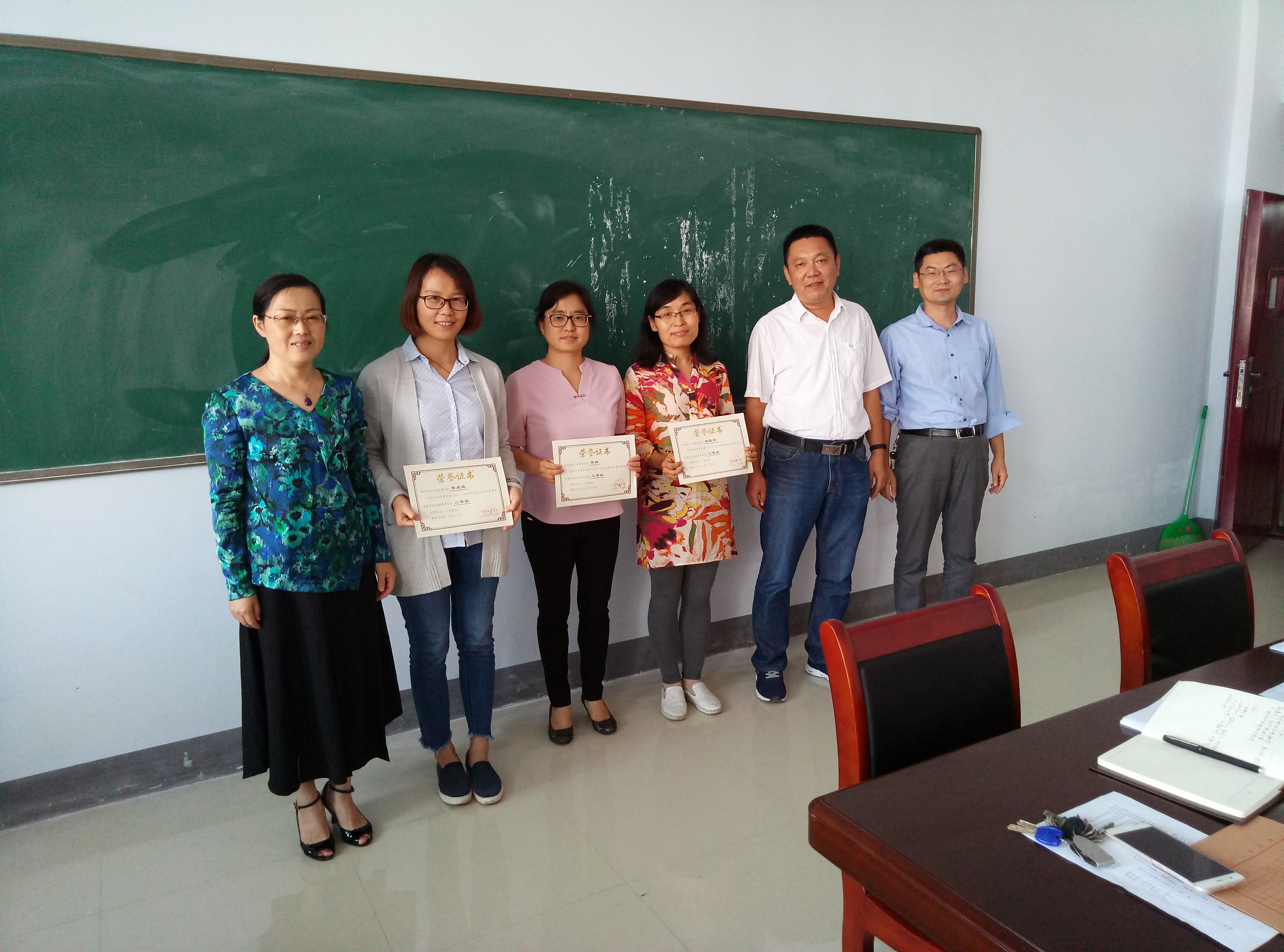 近日,在周口师范学院举行河南省第四届本科高等学校青年教师数学教学技能竞赛中,理学院三位参赛教师经过精心准备,在100多位参赛教师中脱颖而出,喜获佳绩。其中李庆宾老师获得二等奖,常娟老师、杨喜平老师获得三等奖。为表彰先进,在9月28日理学院教职工大会上,院长程少华、党总支书记贺琼、副院长杜银霄分别为获奖教师颁发证书。
