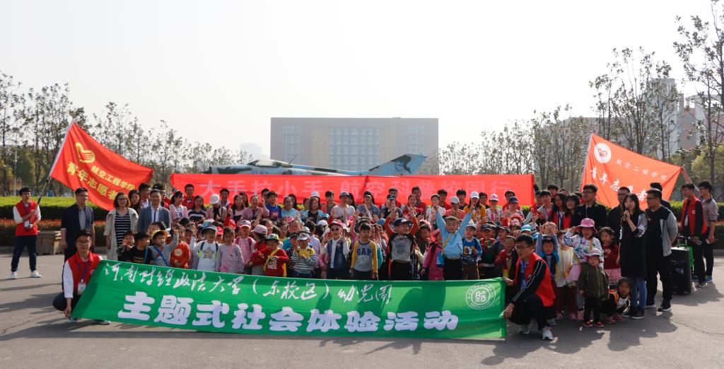 来自河南财经政法大学附属幼儿园的190名儿童,在12名老师和40余名青年志愿者的陪伴下,参观了我校校园里安放的歼七、歼-8I、强-5单座仓强击机等飞机,进行了纸飞机折叠比赛,并在东操场观看了水火箭打靶演示和航模表演等。