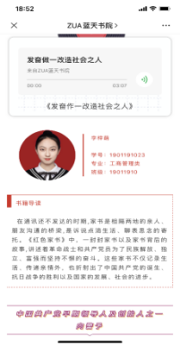 “聆听一段红色故事,走进一段波澜壮阔的历史时光。大家好,这里是蓝天书院初心党建工作室推出的红色专栏,为您讲述红色经典故事,我是领读人王亚强,今天为你分享的是,以身殉志,不亦伟乎——伟大的共产主义的殉道者方志敏,让我们从声音和文字中,穿越历史长河,感知英雄人物‘革命理想高于天’的坚定信仰,感恩他们‘苟利国家生死以’的报国情怀。”“同宅家,共成长,我是蓝天书院红色经典领读人李梓萌,来自工商管理1班,今天给大家带来的是《红色家书》之‘向警予篇’”……
