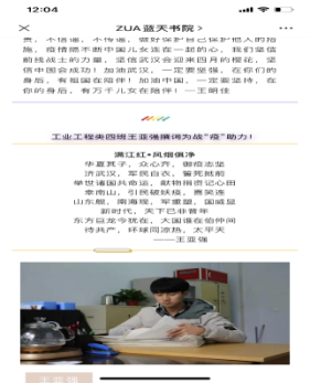 疫情发生以来,蓝天书院按照中央、省委和省教育厅的工作要求,积极开展疫情防控知识宣传,充分挖掘疫情防控期间的育人元素,传播正能量,因势利导帮助学生树立正确的世界观、人生观、价值观。举办“抗疫典型事迹”征集活动,书院共有肖晗、何欣睿等16位青年学子义无反顾地积极投身这场战“疫”,彰显了强烈的使命担当意识和社会责任感。