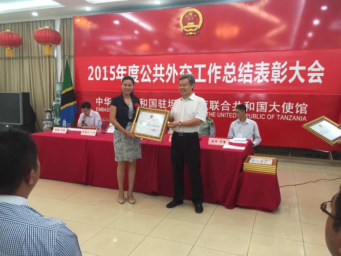 坦桑尼亚当地时间3月27日上午,在中国驻坦桑尼亚大使馆召开的“2015年度公共外交工作总结表彰大会”上,多多马大学孔子学院荣获“公共外交工作先进单位”,“华人在坦桑”微信征文“最佳组织奖”等多项荣誉称号。