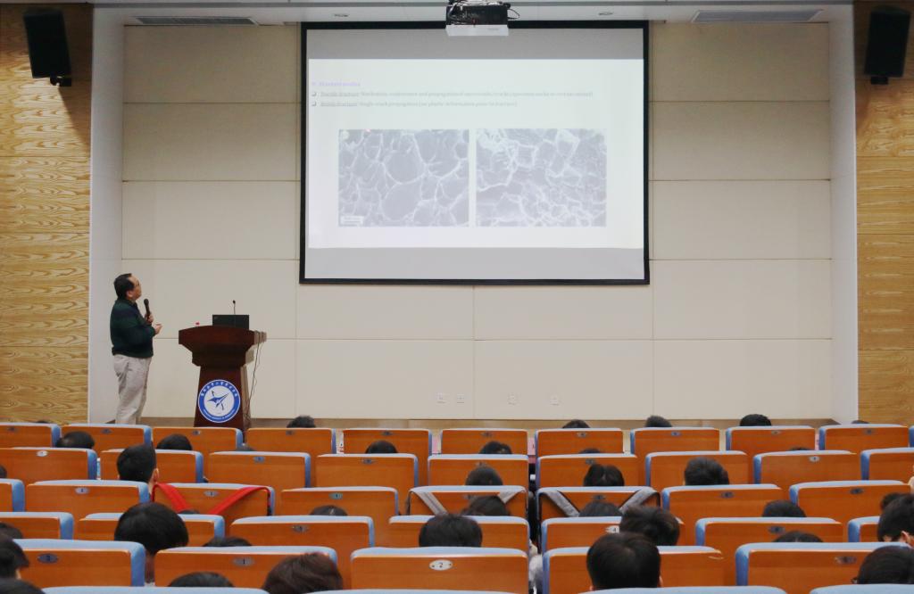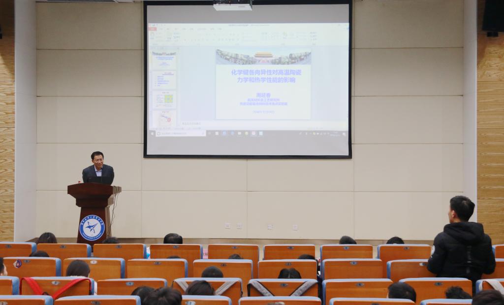 开幕式后,论坛特邀专家——世界陶瓷科学院院士、亚太材料科学院院士、中国运载火箭研究院首席技术专家周延春,我校留学归国博士赵彪先后做题为《化学键各向异性对高温陶瓷力学和热学性能的影响》、《微孔结构对高分子/碳复合材料的介电以及电磁性能的影响》主题报告。