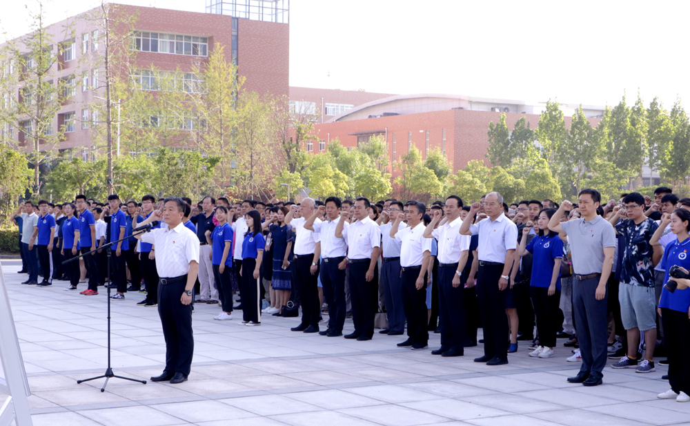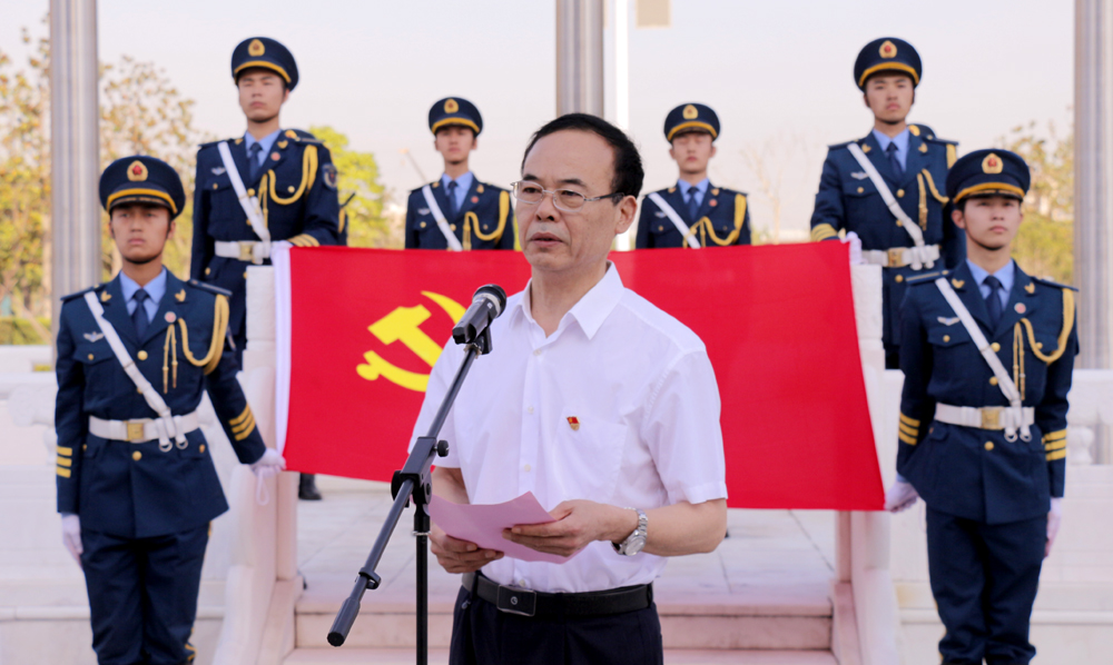 升旗仪式开始,雄壮的《义勇军进行曲》响彻国旗广场上空,鲜艳的五星红旗冉冉升起。随后,全校近两千名共产党员和新党员一起面向党旗,举起右手,在领誓人、校党委副书记石培哲的带领下庄严宣誓:“我志愿加入中国共产党,拥护党的纲领,遵守党的章程,履行党员义务,执行党的决定……”。郑重的誓言,激昂慷慨地声音表达了全体共产党员为共产主义事业奋斗终身的决心和愿望,坚定为共产主义事业奋斗终身的信念。