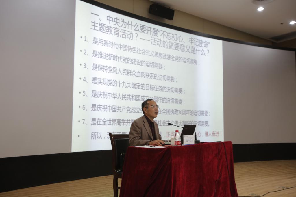 专题报告会上,马平轩深刻论述了习近平新时代中国特色社会主义思想产生的历史背景和必然性,同时结合丰富的案例,围绕“为什么要开展‘不忘初心、牢记使命’主题教育活动——活动的重要意义是什么”“如何有效开展‘不忘初心、牢记使命’主题教育活动——习近平总书记如是说”“廓清关键概念以提升思想境界,确保主题教育活动效果”“党员干部应该做‘不忘初心梦想,坚定理想信念,勇于担当使命,善于积极作为’的表率”等四个部分进行了全面系统的阐述。