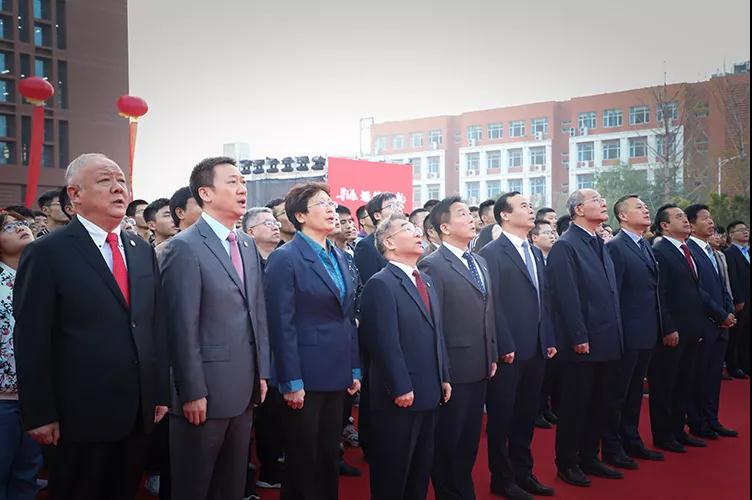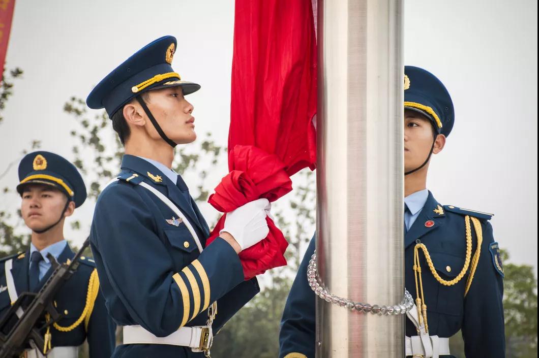 伴随着雄壮激昂的国歌,五星红旗冉冉升起,迎风招展。