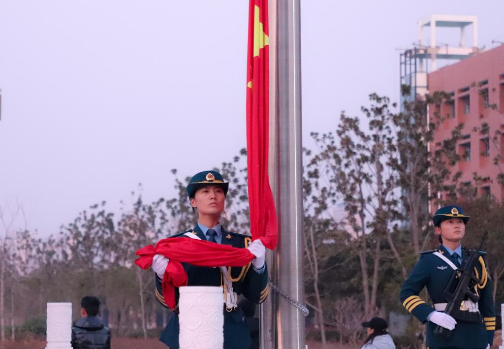 “升国旗!”伴随着雄壮激昂的《义勇军进行曲》,鲜艳的五星红旗冉冉升起,参加升旗仪式的全体师生面向国旗行注目礼、齐唱国歌。