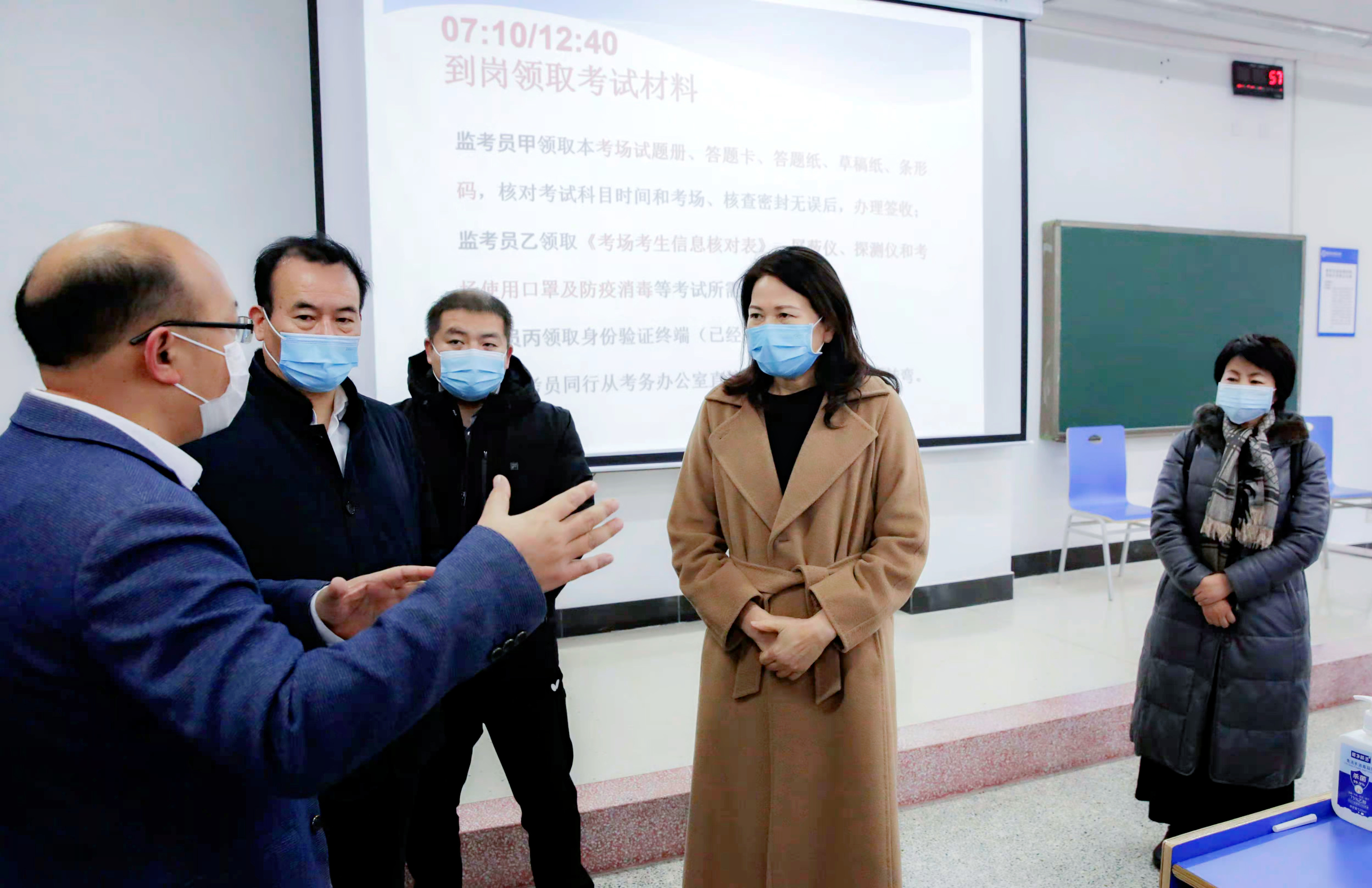 12月24日,河南省副省长霍金花来到我校龙子湖校区,检查指导2022年全国硕士研究生招生考试疫情防控措施落实情况和各项考试组织工作。省政府副秘书长尹洪斌、省卫健委副主任黄红霞、省教育考试院党委书记刘刚陪同检查。我校在校校领导付强、杨培、申金山、张文强、李广慧、王继东、李捷等参加检查。