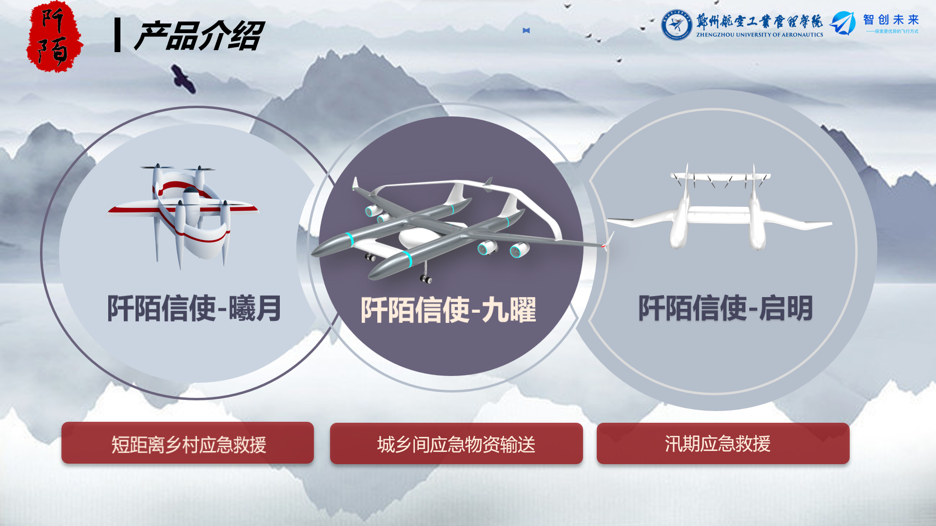 《阡陌信使——智慧化无人空中运载平台》项目,关注到当前山村中应急医疗物资运输困难的问题,提出了包含九曜、曦月、启明三个型号的陌信使系列无人机。基于该无人机载体和多任务吊舱,用户可实现在乡村任务模式中完成突发事件应急救援、建立城乡之间的应急生物样本冷链物流网络、河道应急救援、解决乡村物流的最后一公里难题、乡村环境保护地的监测与执法等多重任务场景。