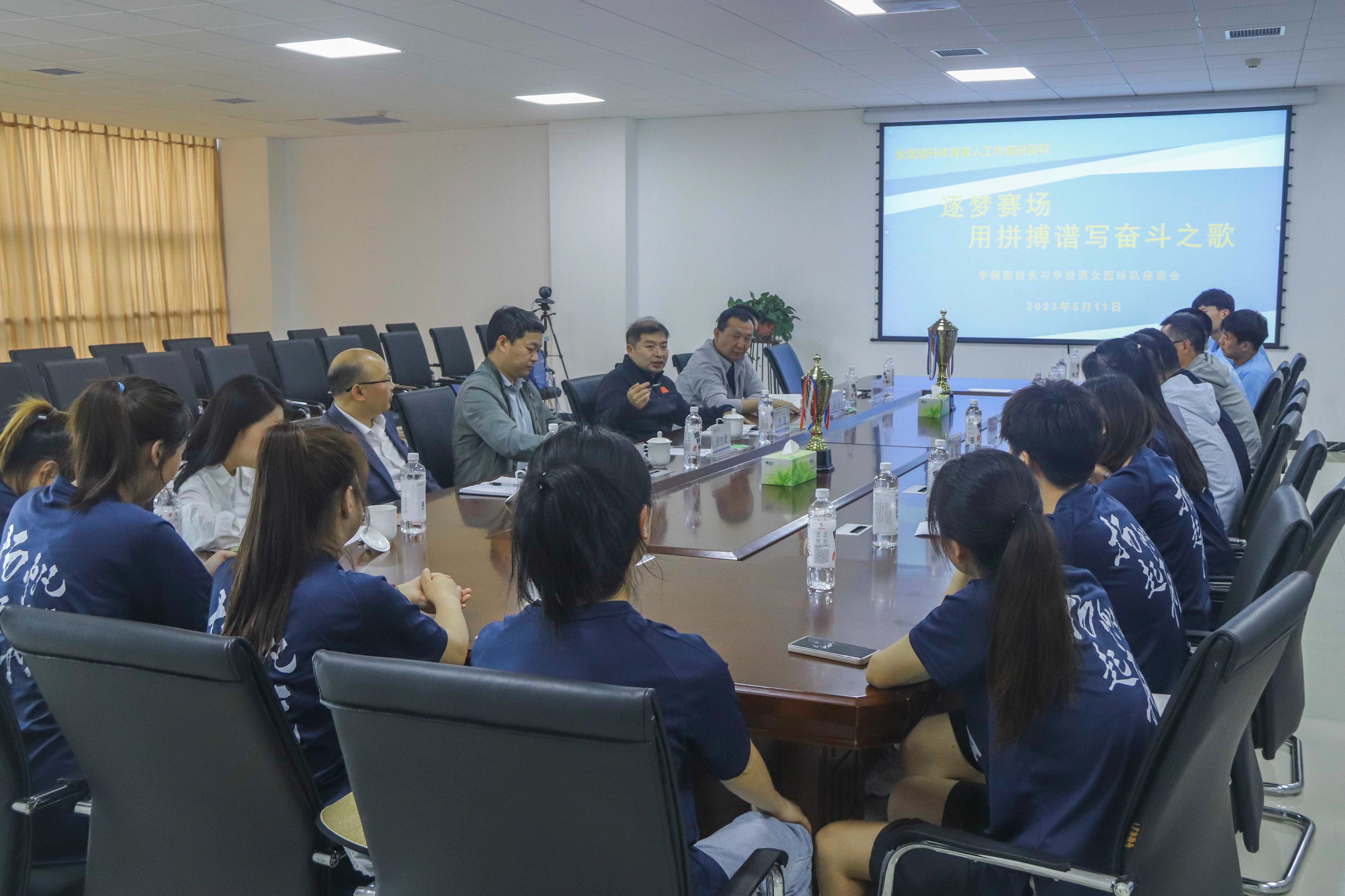 5月11日,校党委委员、校体育运动委员会主任、副校长李捷到体育与公共艺术部调研指导体育育人工作,并与我校获得第29届河南省大学生“华光”体育活动篮球赛冠军和季军的篮球队全体成员进行座谈。