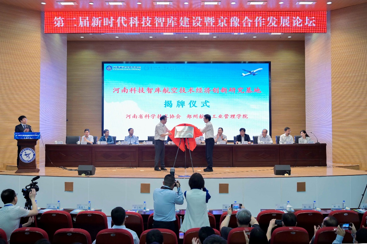 智库授牌环节,校党委书记付强与河南省科协主席吕国范共同为“河南科技智库航空技术经济创新研究基地”揭牌。