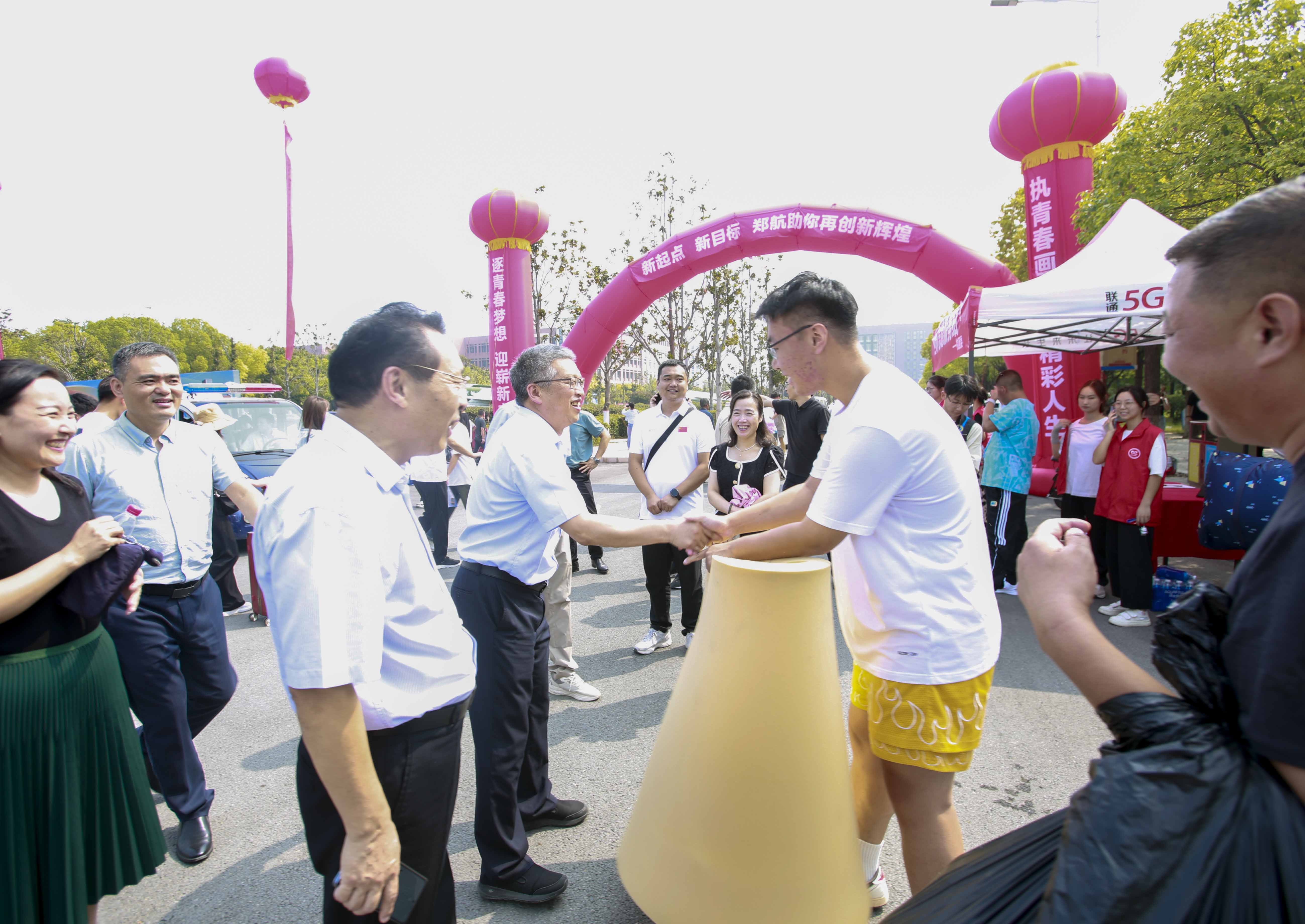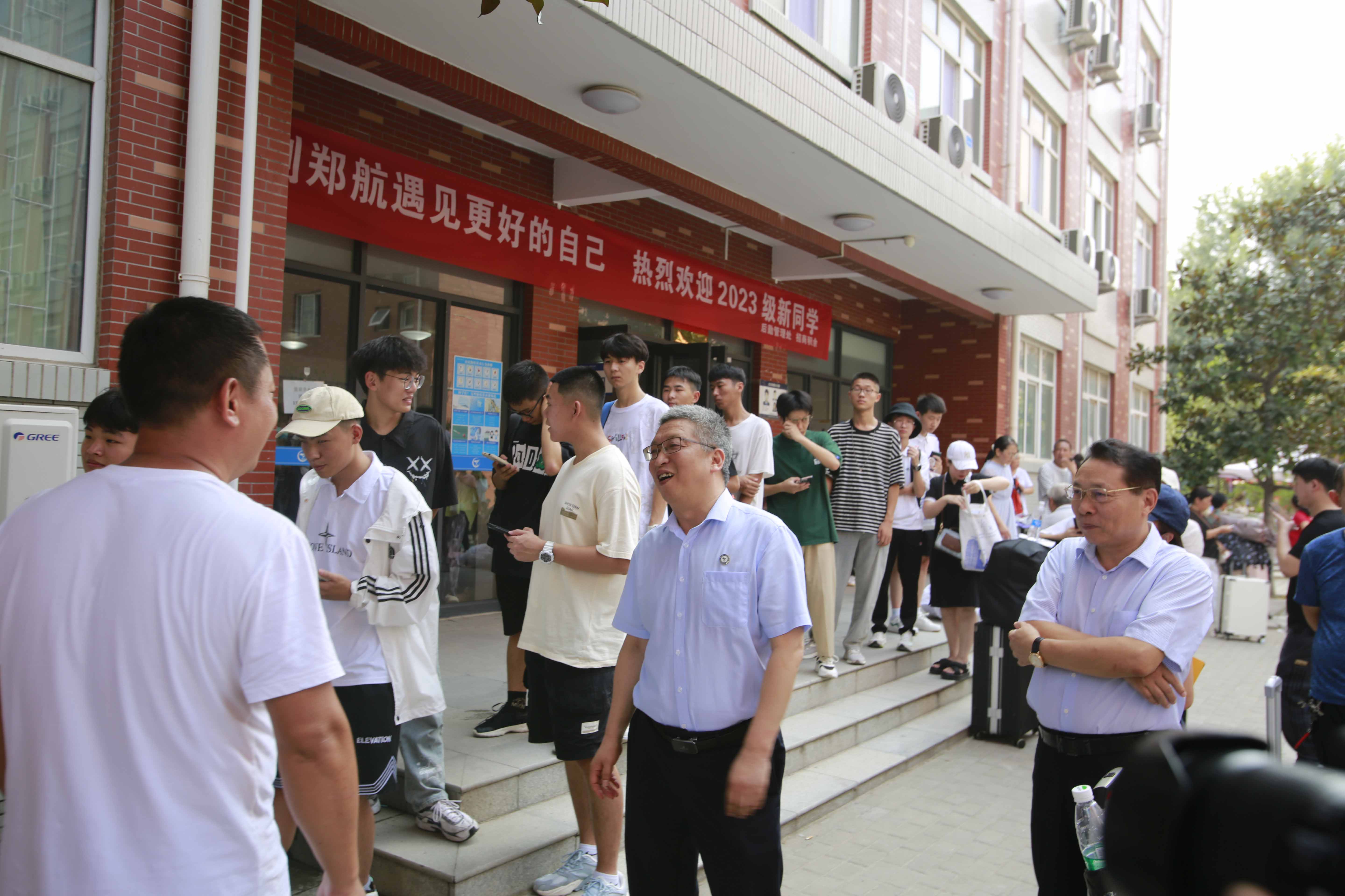 云天收夏色,木叶动秋声。9月5日,青春的活力充满着校园每一个角落。来自全国各地的2023级本科、研究生新生,怀揣梦想来到郑州航院,开启崭新的大学校园生活。校长刘代军,副校长王继东、李广锋先后到学校北门、西门、西苑餐厅、中心广场、超市、南门、学生宿舍等新生密集区域,检查新生开学报到工作,与新生及新生家长亲切交谈,向参加迎新工作的师生和志愿者表示慰问。