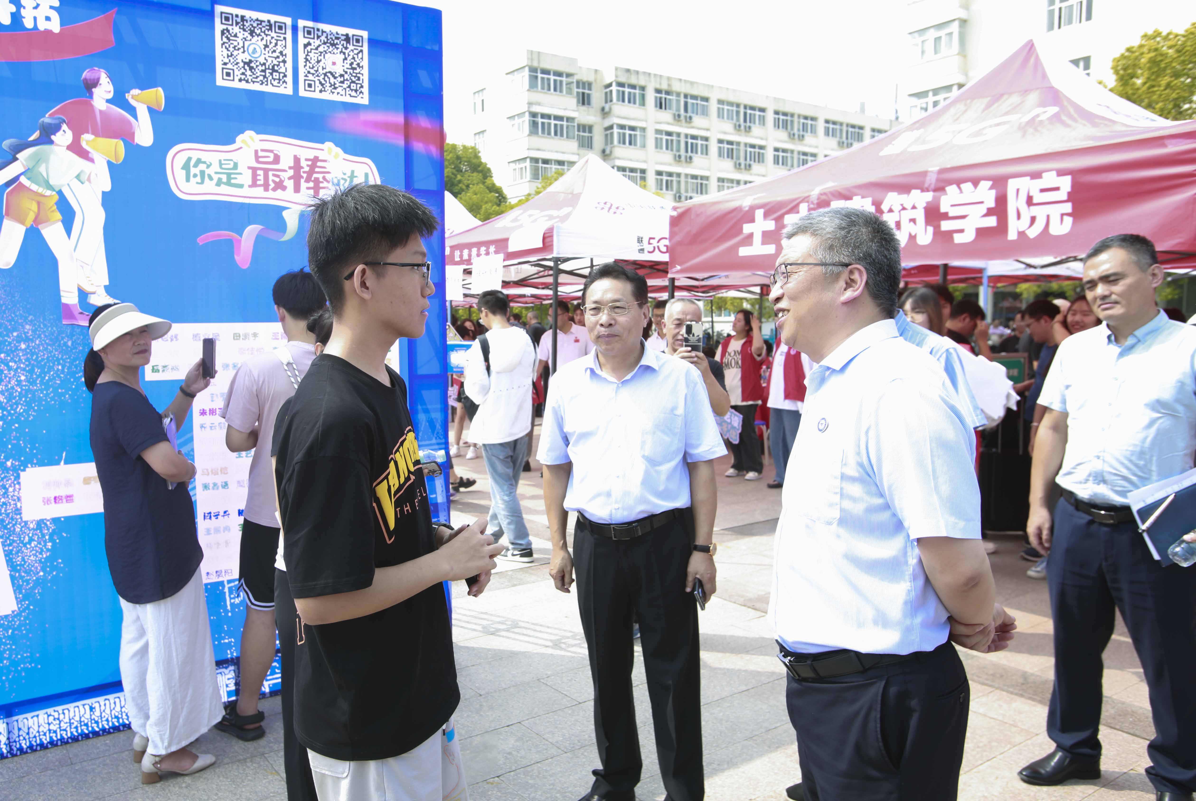 在中心广场新生报到点,校领导细致走访了各学院迎新报到点,向现场接待新生的学院负责人、辅导员、志愿者详细询问新生报到流程、迎新工作进展、迎新活动开展等情况,并听取现场工作人员汇报“迎新大礼包”配备、“绿色通道”申请和各专业报到人数等情况。刘代军对迎新所做的细致周到的服务和准备工作给予了充分肯定,与前来报到的新生及新生家长亲切交谈,询问来校路途、入校感受、对学校的期许。在特色迎新区域,刘代军还和部分等候的新生合影留念。