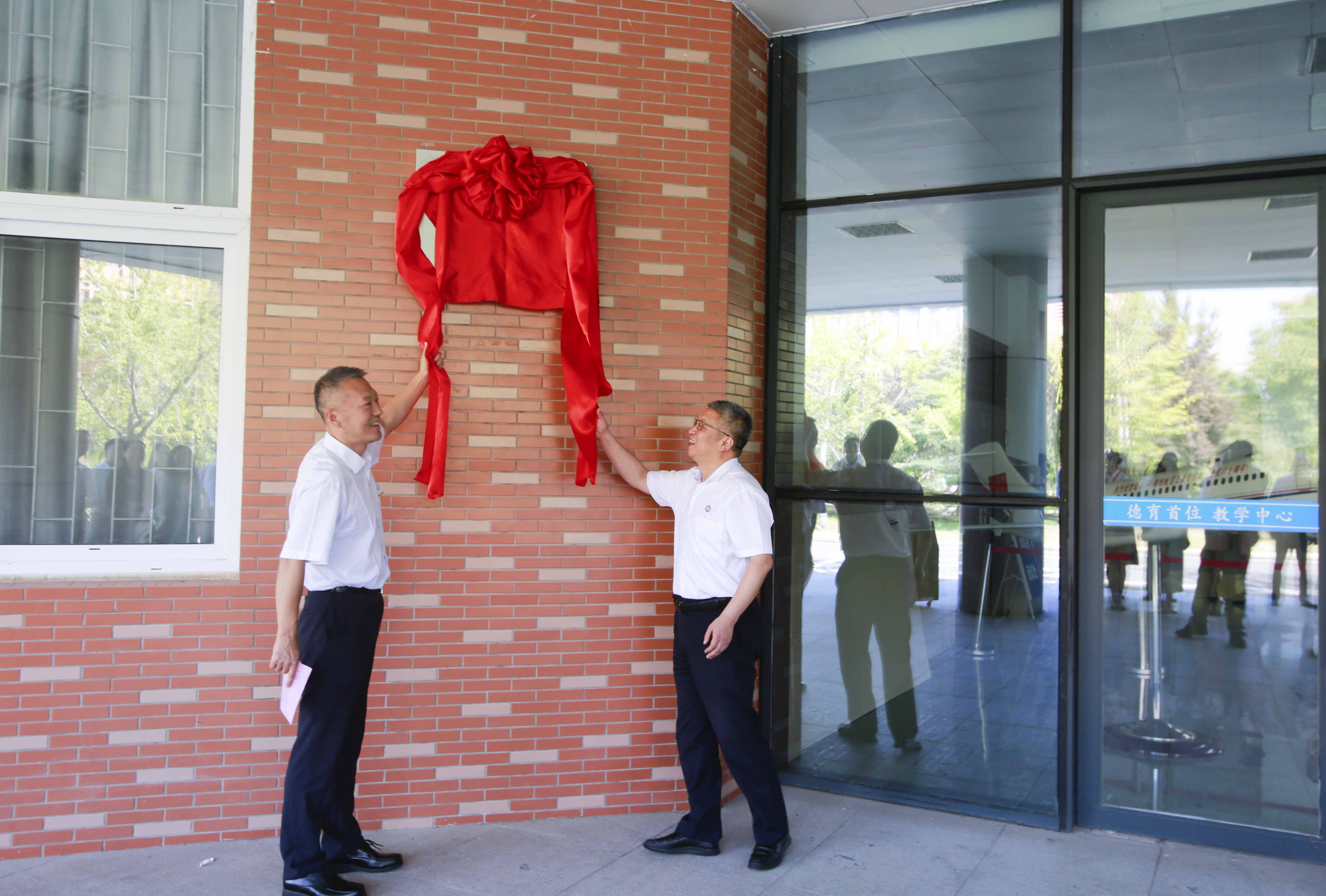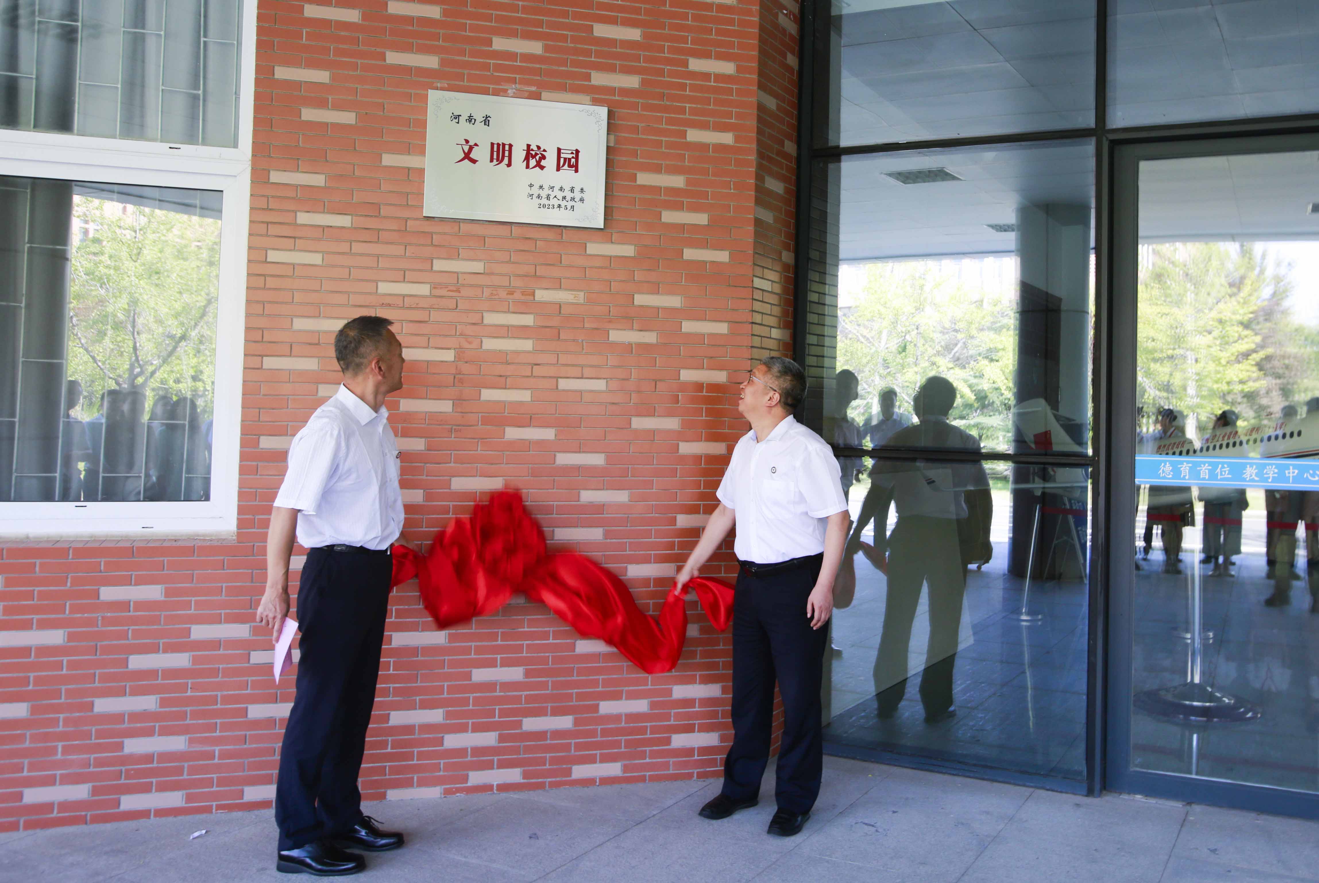 刘代军和杨培共同为第二届“河南省文明校园”揭牌。