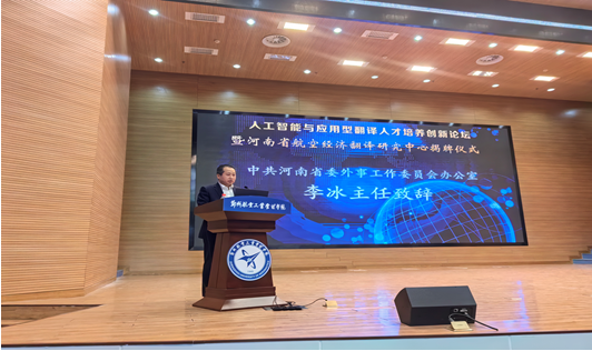 李冰在致辞中指出,省委外办与郑州航院共建“河南省航空经济翻译研究中心”,既是深入贯彻习近平总书记关于加强和改进国际传播能力建设的系列重要指示精神,认真落实省委省政府决策部署的具体行动,也是对外讲好新时代“河南故事”,推动河南对外话语体系向纵深发展的实际举措。李冰希望,“河南省航空经济翻译研究中心”在省委外办的指导和支持下发挥优势、协同创新,紧紧围绕航空经济翻译研究与传播,培养更多优秀翻译人才,助力河南航空经济走向世界,展示河南航空航天成就,切实增强新形势下加强和改进国际传播工作的使命感和责任感,为构建新时代河南省对外话语体系贡献更多智慧和力量。