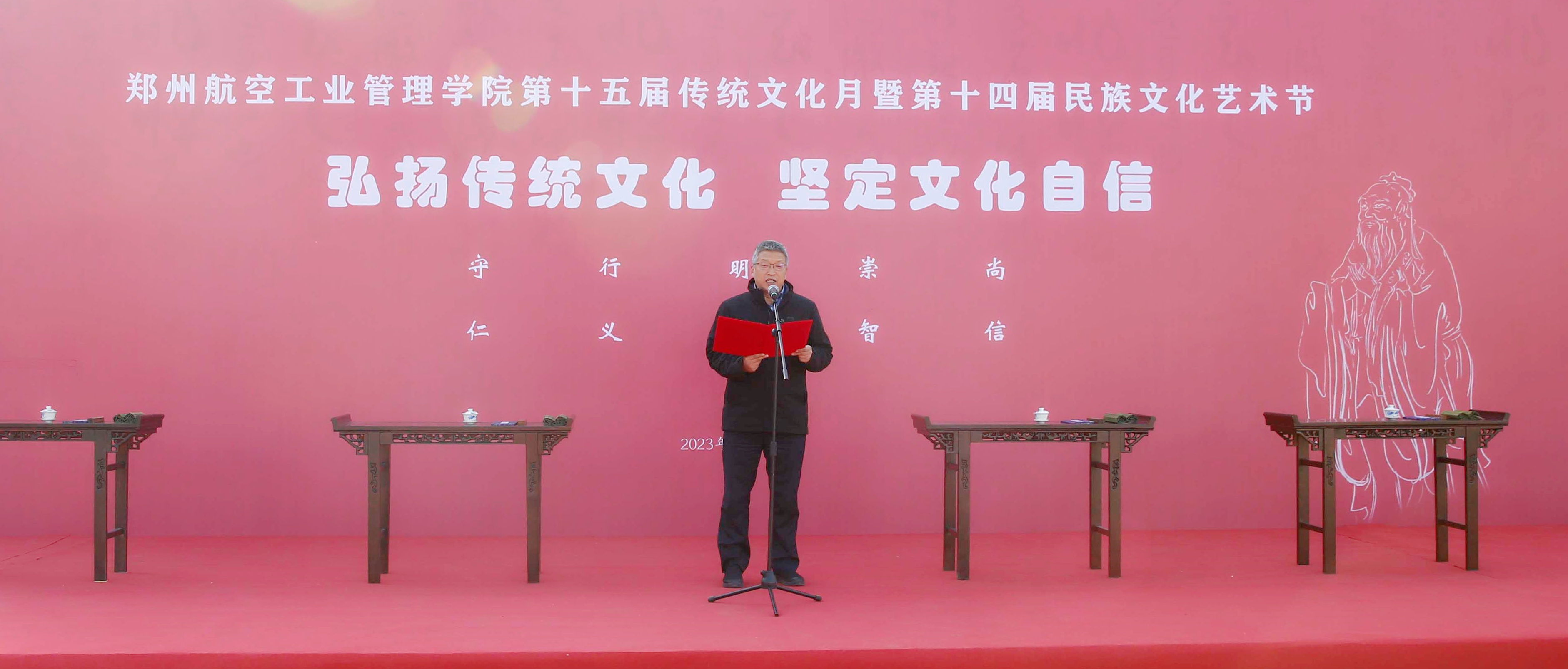 刘代军在致辞中指出,高校承担着文化传承的历史使命。广大师生是传承和弘扬中华优秀传统文化最具活力的主体,是推动中华优秀传统文化创新性发展、创造性转化的重要力量。当前,我校正处于更名航空航天大学的关键时期,高水平航空航天大学建设离不开高品质校园文化的支撑,离不开中华优秀传统文化的涵养滋润。刘代军强调,相关单位要精心策划组织,加强统筹协调,形成育人合力,积极营造传承和弘扬中华优秀传统文化的氛围,切实把活动做精、把品牌擦亮、让文化润心,真正做到以文载道、以文传声、以文化人。刘代军希望,广大师生要深入学习和全面贯彻习近平文化思想,弘扬中华优秀传统文化,铸牢中华民族共同体意识,争做中华优秀传统文化的弘扬者和传承者,争做中华现代文明的创造者和倡导者。