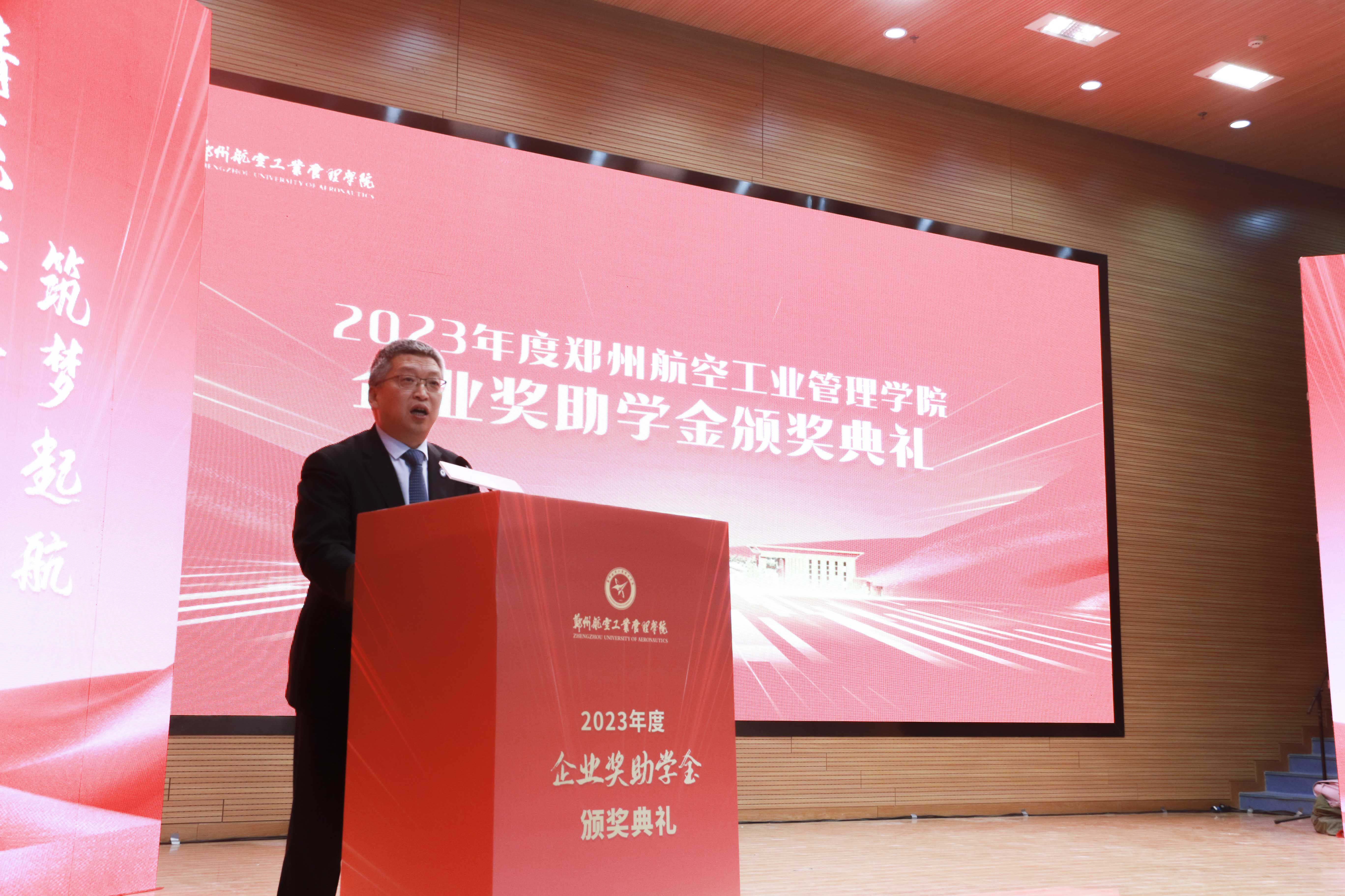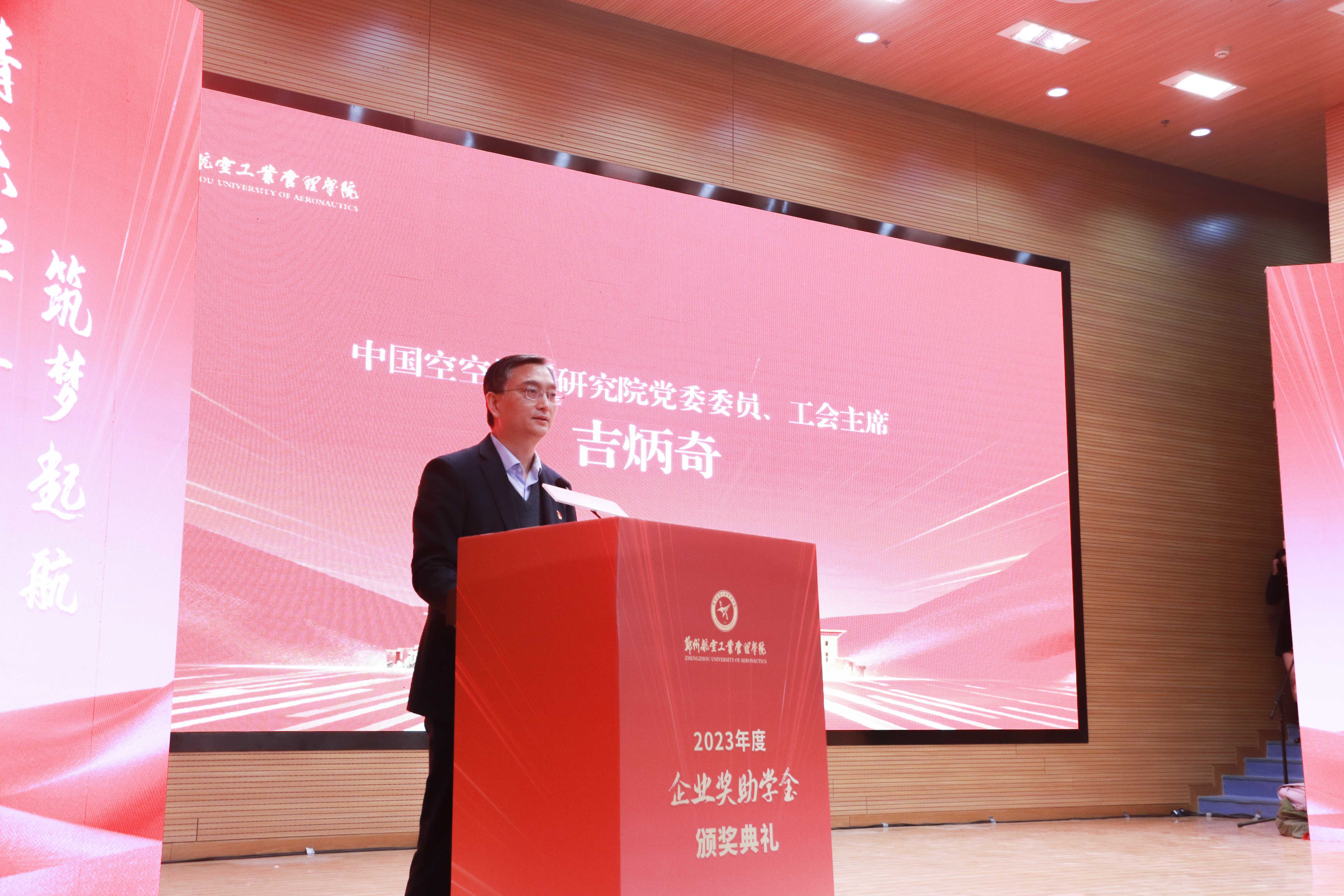 吉炳奇作为设奖单位代表发言,对获得奖助学金的同学表示祝贺。他表示,办好教育是全社会的共同责任,中国空空导弹研究院情系教育、支持郑航,同广大师生建立了良好的合作关系,未来将会继续支持郑航发展,深化与学校的合作交流,不断巩固和扩大合作成果,实现校企双方在更多领域的互利共赢。
