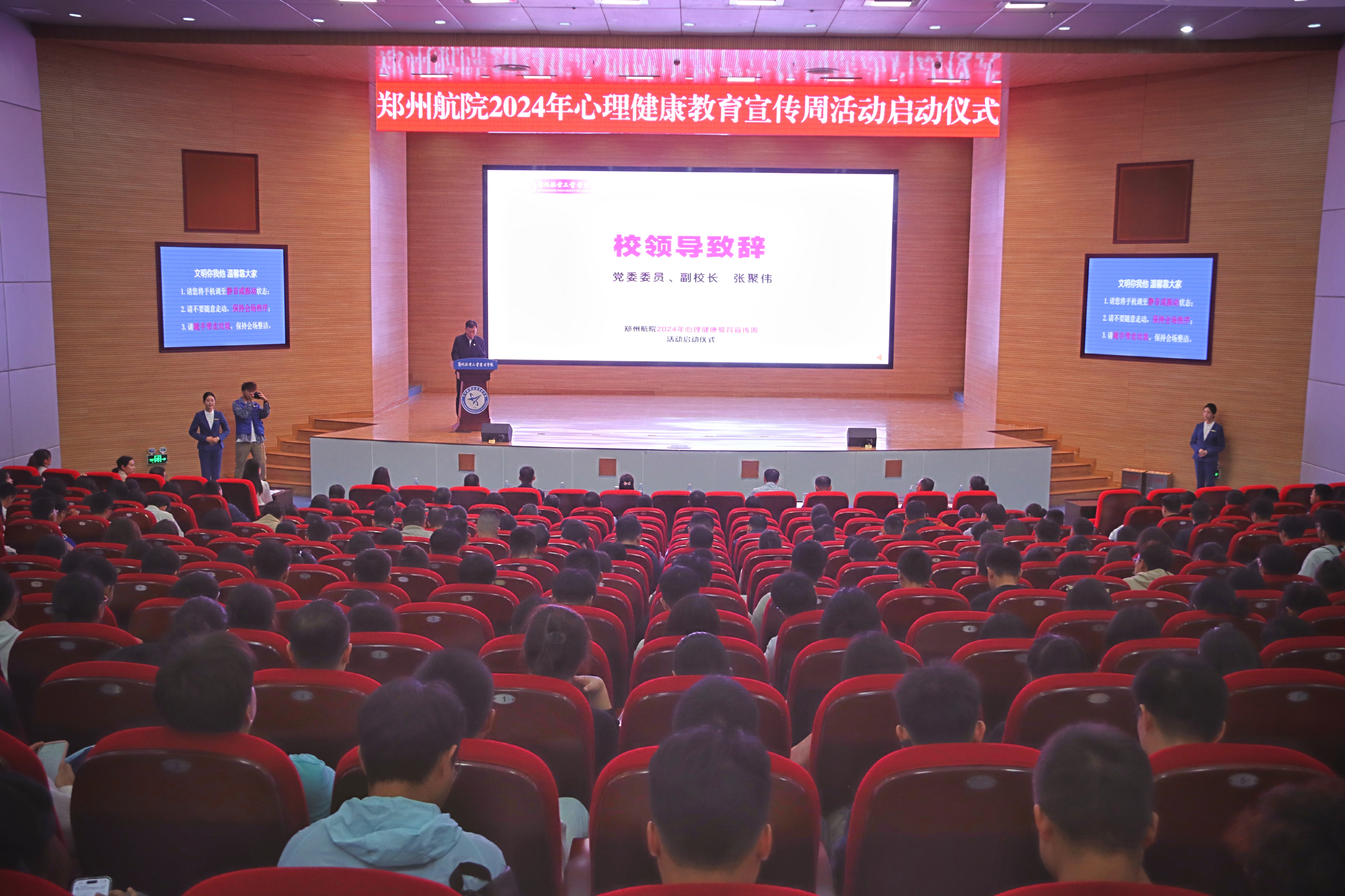 张聚伟在致辞中指出,大学生心理健康教育工作是高校落实“立德树人”根本任务的重要内容,当前社会环境下,大学生面临诸多压力与挑战,加强心理健康教育工作尤为重要。他强调,要全面贯彻“三全育人”理念,把心理健康教育工作全程融入学生学习成长各个阶段;要进一步完善心理健康教育体系,注重发挥心理健康教育合力,实现心理健康教育与“五育”的有机融合;要加强心理健康教育工作的责任感和使命感,增强全校师生对心理健康的正确认知,共同营造更加健康和谐的校园心理文化氛围。