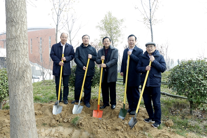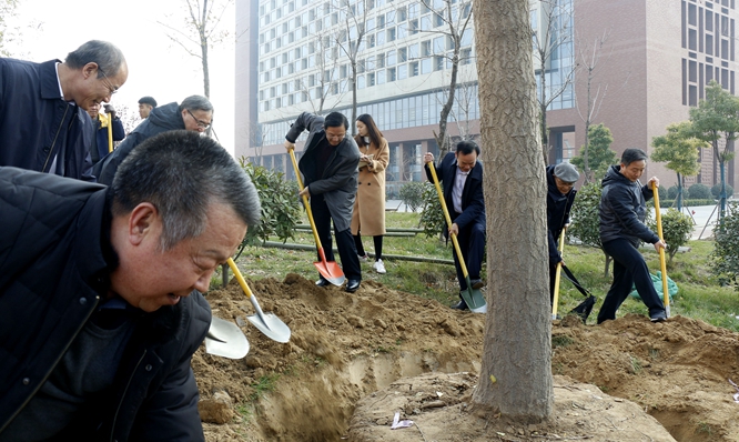 在植树过程中,顾惠忠与党委书记付强、院长李勇等校领导一起为银杏树填土浇水,并亲切交谈。
