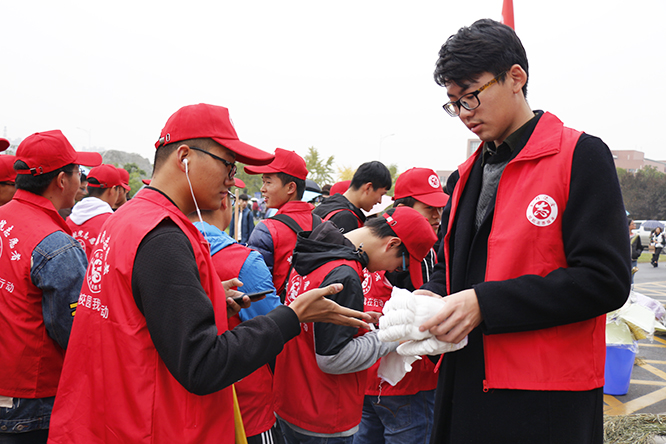 仪式结束后,身着红色志愿服、头戴小红帽的教师和学生在雨中手持工具,相互协作,进行了有序清扫。 (新闻中心 李绍巍 大学生记者 刘晓艺 大学生实习记者 汪程斌 刘晨红)