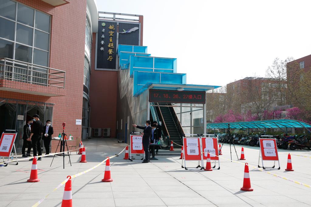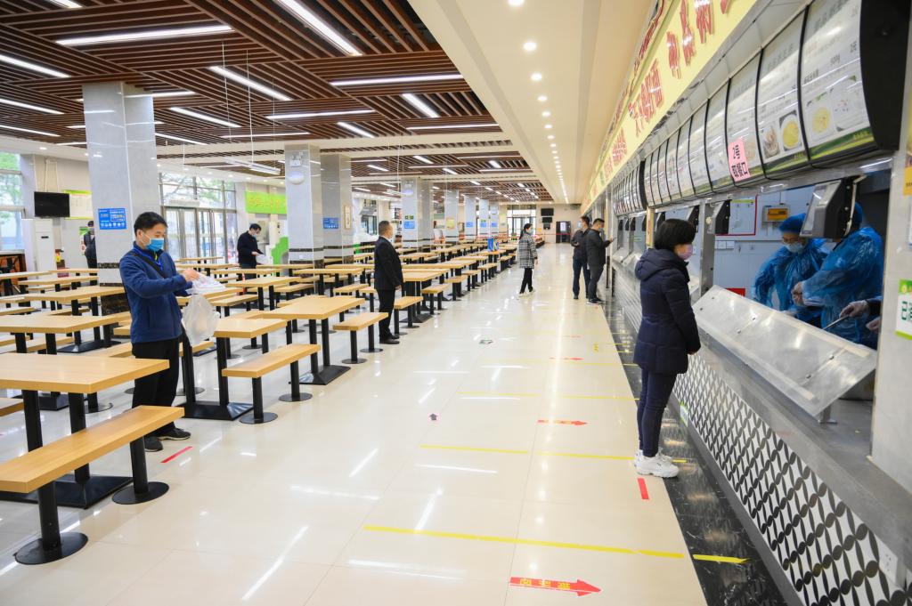 在“错峰取餐”演练中,每个宿舍选派1到2名学生,凭借“服务保障卡”,在网格长和网格员的统一指挥下,按照预案规划的取餐时间和取餐路线,单向进入对应餐厅的对应窗口,领取“标准配餐”。