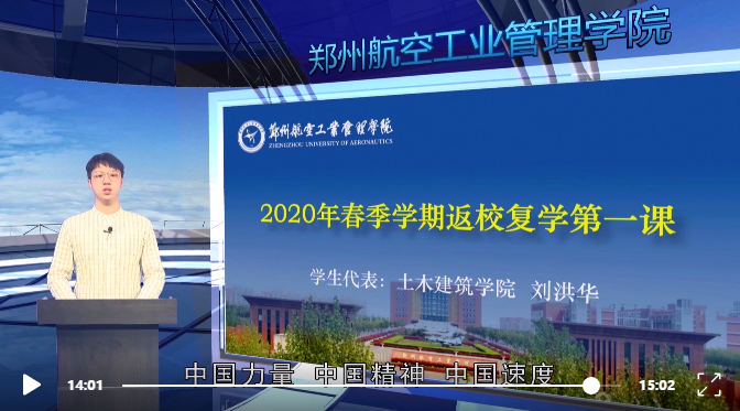 学校还组织返校学生观看了由河南省教育厅统一录制的全省高校“返校复学第一课”微课视频和特别录制的“河南省新冠肺炎疫情防控优秀大学生群体”成员、我校智能工程学院学生赵文赐先进事迹介绍等专题视频。