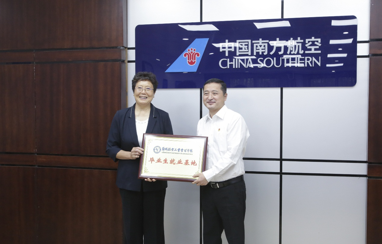 张文强与卢忠建共同为郑州航院毕业生就业基地揭牌。我校发展规划处处长陈静、南航河南公司人力资源部经理李彦波分别代表校企双方签署战略合作框架协议。