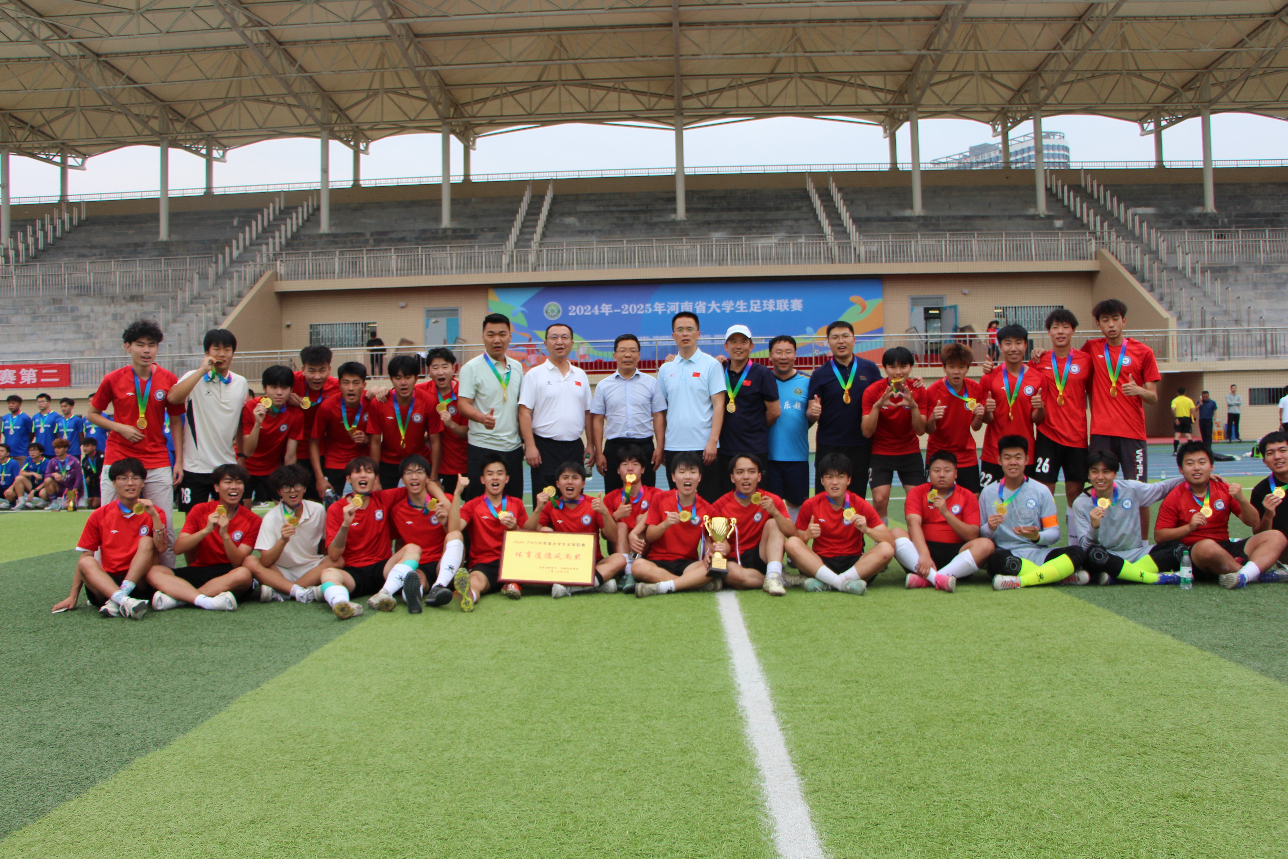 为了推动我省校园足球运动的开展,2024-2025河南省大学生足球联赛采取“大区赛+决赛阶段主客场制”的全新赛制,本专科院校合并进行,历时近半年的比赛吸引了来自52所高校的近1500名运动员参加。我校足球队在俞宏光、寇冠、李民强老师的带领下,坚持科学训练、刻苦备战,凭借顽强的斗志、精湛的球技和默契的团队配合在分区赛、复赛和决赛中先后战胜对手,荣获联赛冠军。